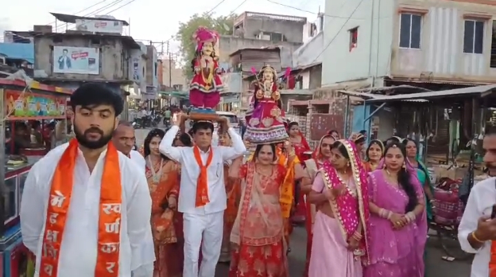 मनासा। रविवार को सोनी महिला मंडल द्वारा आयोजित गणगौर चल समारोह श्रद्धा और उत्साह के साथ सम्पन्न हुआ। एवं नगर में भव्य शोभायात्रा निकाली गई यह भव्य शोभायात्रा सोमनाथ महादेव मंदिर से प्रारंभ होकर बम्बई वालों की धर्मशाला तक निकाली गई। समारोह में समाज की महिलाओं ने पारंपरिक लहंगा-चुनरी पहनकर सोलह श्रृंगार के साथ भाग लिया। महिलाएं गणगौर माता की प्रतिमा को सिर पर धारण कर भजन-कीर्तन एवं मंगल गीत गाते हुए पूरे मार्ग में भक्तिमय वातावरण निर्मित कर रही थीं। चल समारोह के दौरान स्थान-स्थान पर पुष्प वर्षा से स्वागत किया गया एवं नाश्ते का प्रबंध भी किया गया। इस अवसर पर समाज के गणमान्य नागरिक भी उपस्थित रहे और कार्यक्रम की सराहना की। अंत में सभी ने गणगौर पूजन एवं स्वल्पाहार लिया। सोनी महिला मंडल की अध्यक्ष श्रीमती किरण राजेश सोनी एवं समस्त टीम के सहयोग से यह आयोजन सफलतापूर्वक सम्पन्न हुआ। अंत में सभी समाज जनों एवं सहयोगियों का आभार व्यक्त किया गया।
